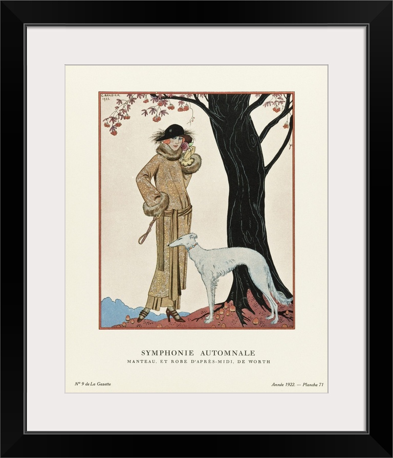 <p>Symphonie Automnale. Autumn Symphony. Manteau et Robe d'apres-midi, de Worth. Afternoon coat and dress by Worth. Art-deco fashion illustration by French artist George Barbier, 1882-1932. The work was created for the Gazette du Bon Ton, a Parisian fashion magazine published between 1912-1915 and 1919-1925.</p>
