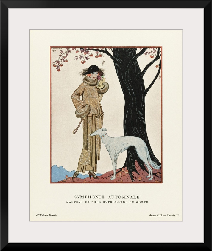 <p>Symphonie Automnale. Autumn Symphony. Manteau et Robe d'apres-midi, de Worth. Afternoon coat and dress by Worth. Art-deco fashion illustration by French artist George Barbier, 1882-1932. The work was created for the Gazette du Bon Ton, a Parisian fashion magazine published between 1912-1915 and 1919-1925.</p>