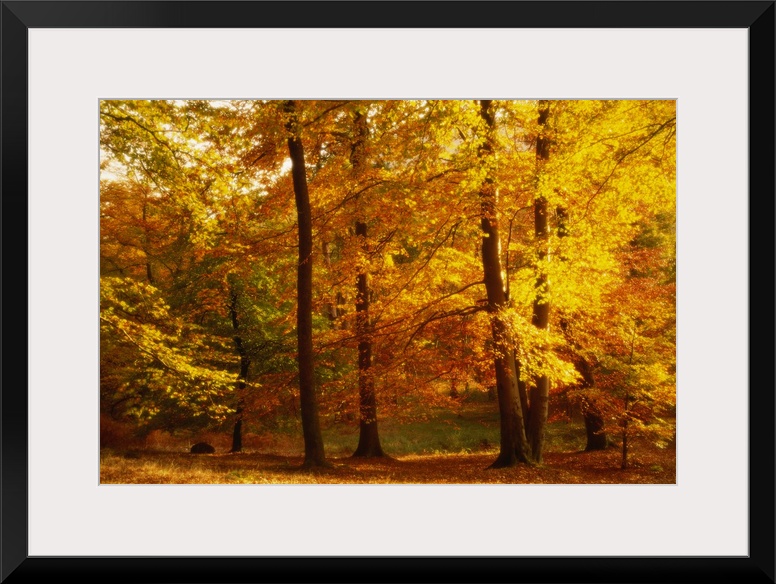 <p>Large photograph displays a set of glowing trees as they sit within an open forest found in the United Kingdom.</p>