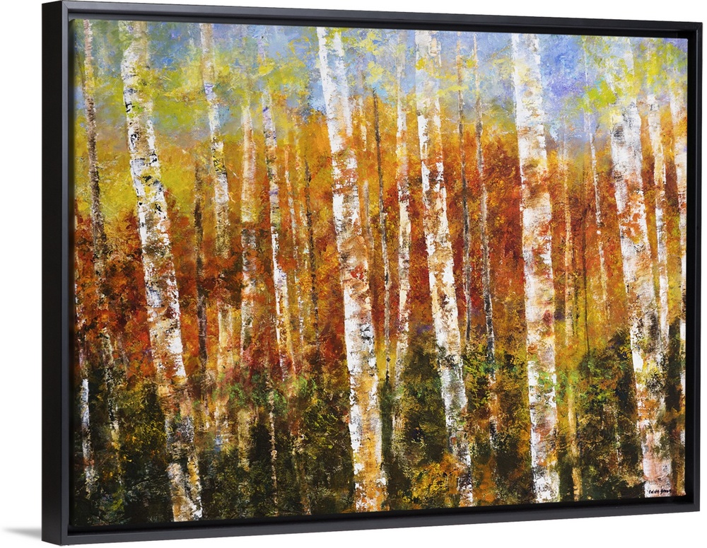 <p>Contemporary painting of a forest of aspen trees surrounded by autumn colors.</p>