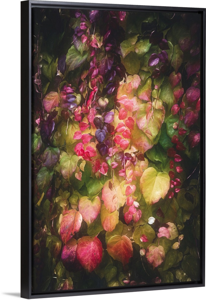<p>Vibrant foliage in a kaleidoscope of colors, including shades of pink, purple, and green, creates a lush, cascading effect. The play of light and shadow enhances the depth and richness of the leaves, suggesting a sense of movement and life.</p>