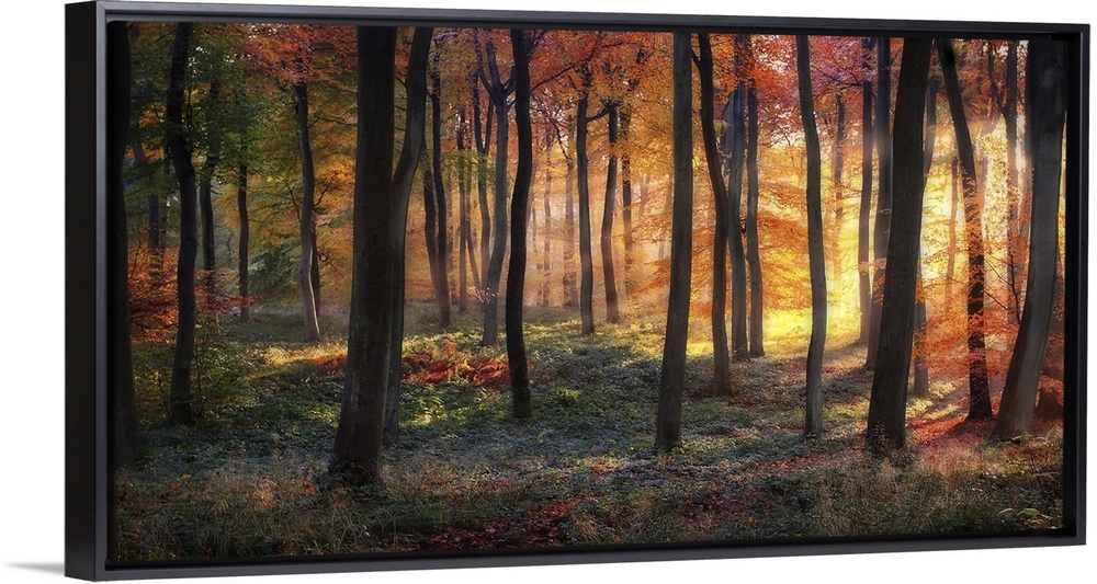 <p>An autumn forest lit ablaze in the light of the sunrise.</p>