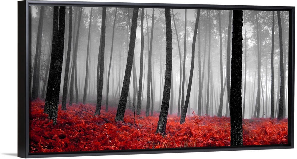<p>A panoramic photograph of a monochrome forest with bright red bed of plants.</p>