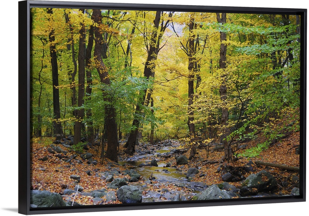 <p>Autumn woods with yellow maple trees and creek with rocks and foliage in mountain.</p>