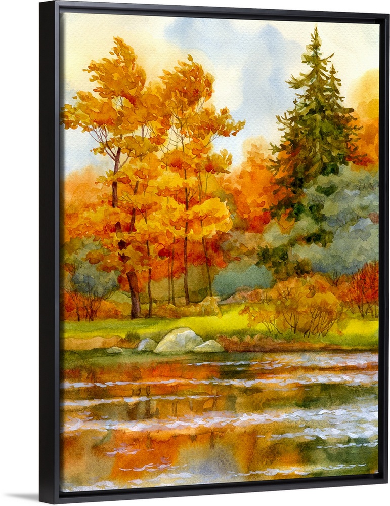 <p>Watercolor landscape of an autumnal forest on the lake.</p>