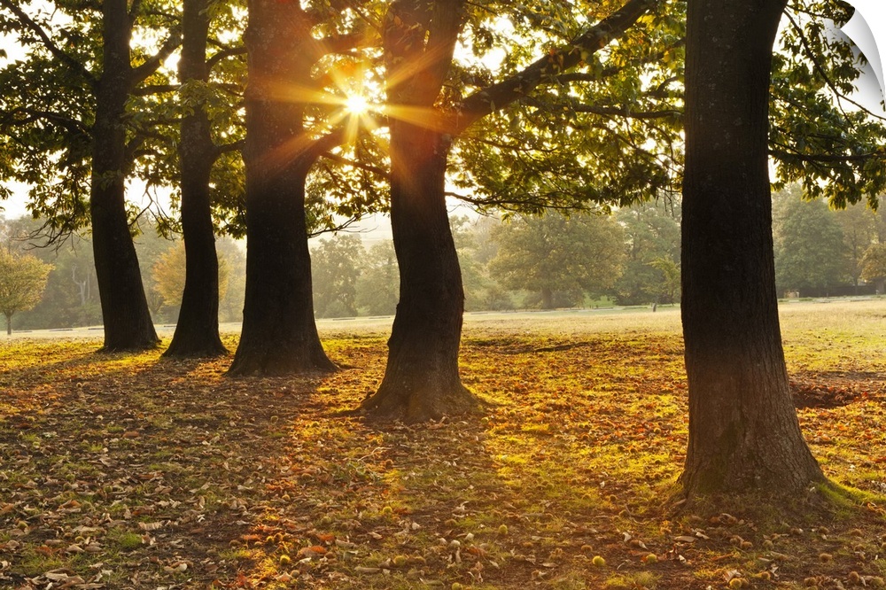 <p>Autumnal sunrise viewed through a row of trees in Knole Park.</p>