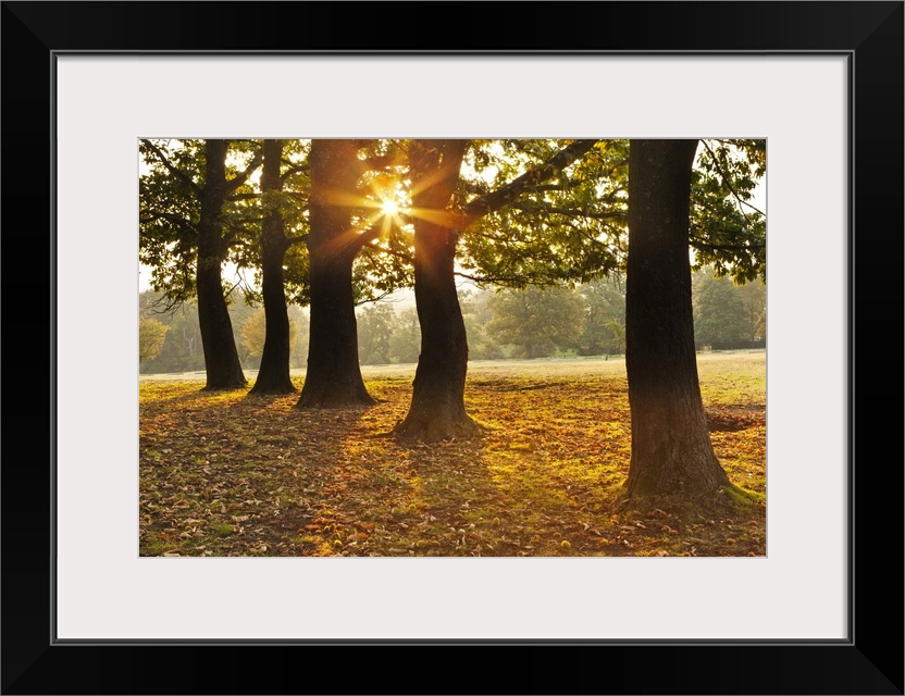 <p>Autumnal sunrise viewed through a row of trees in Knole Park.</p>