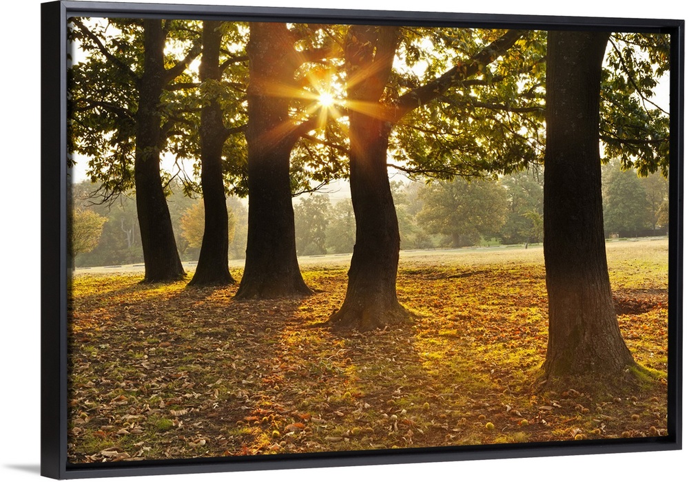 <p>Autumnal sunrise viewed through a row of trees in Knole Park.</p>