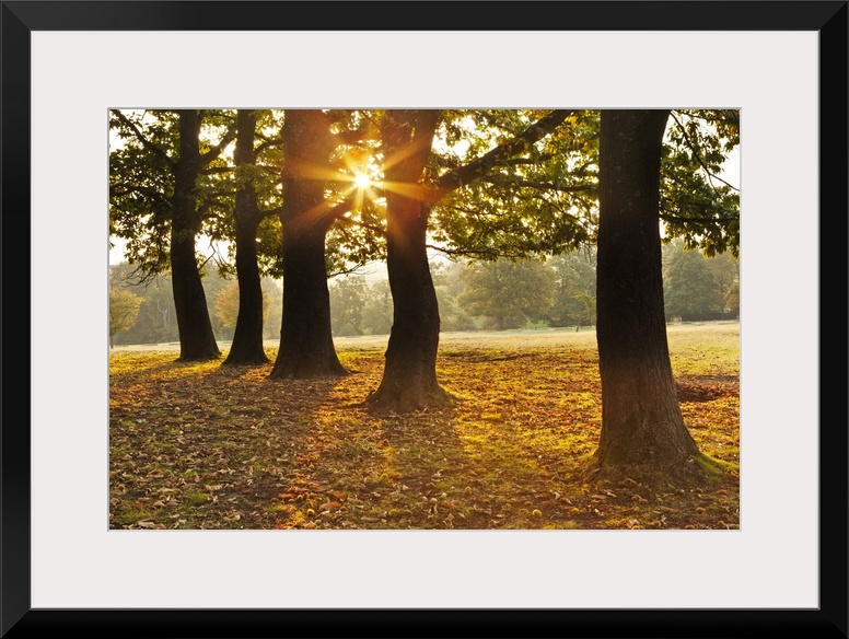 <p>Autumnal sunrise viewed through a row of trees in Knole Park.</p>