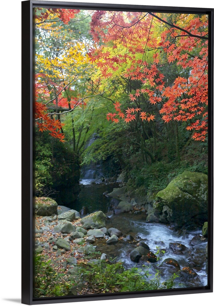 <p>Photograph of a forest in the fall with a peaceful stream running through it.</p>