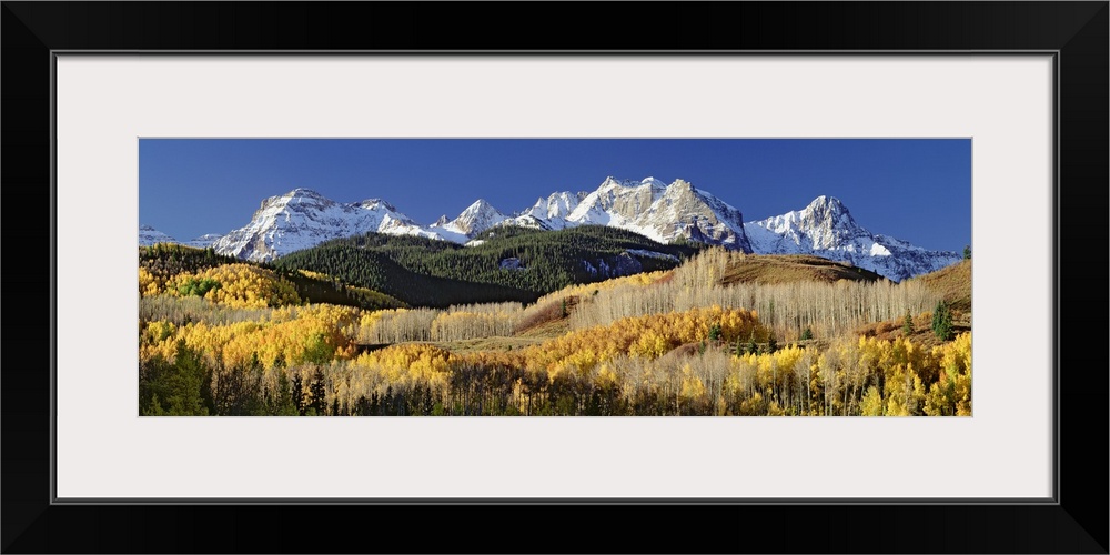 <p>A wide angle photograph of a large forest during the fall season with snow covered mountains just behind it.</p>
