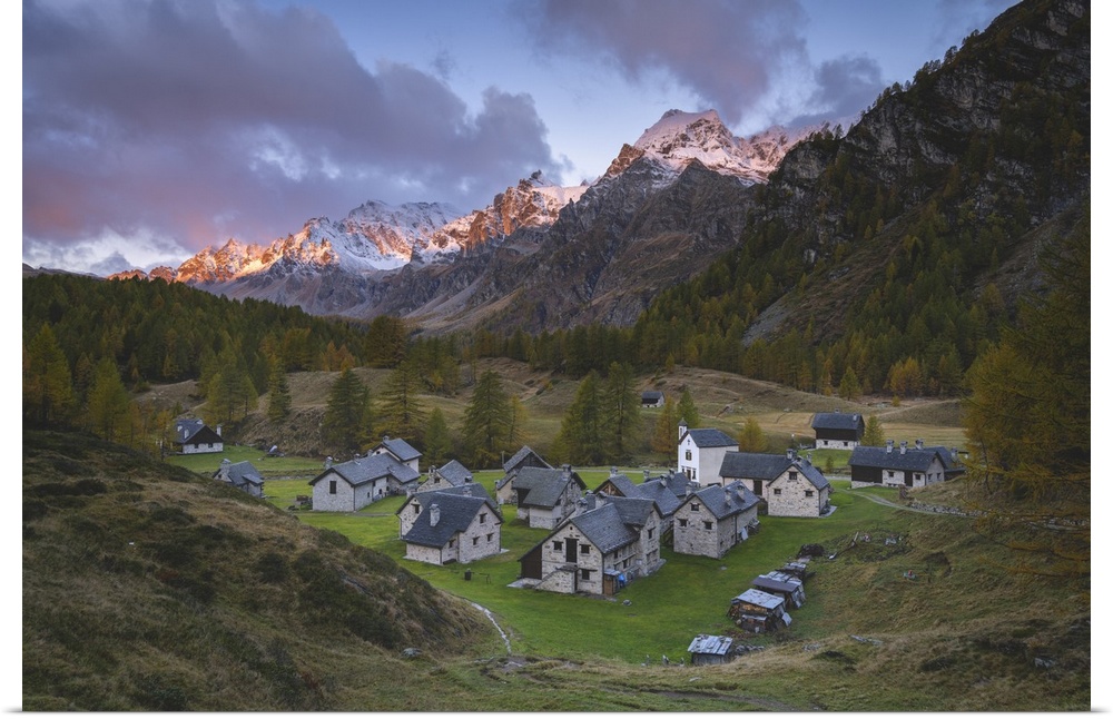 <p>Autumnal view of the Crampiolo town with the mountains surrounding Alpe Devero. Alpe Devero, Devero valley, Antigorio valley, Ossola valley, Piedmont, Verbano Cusio Ossola district, Italy.</p>