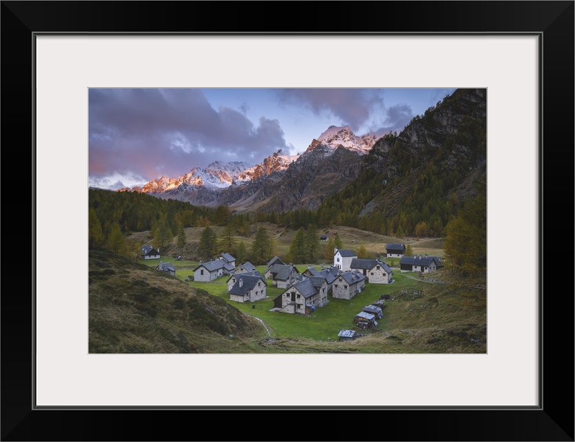 <p>Autumnal view of the Crampiolo town with the mountains surrounding Alpe Devero. Alpe Devero, Devero valley, Antigorio valley, Ossola valley, Piedmont, Verbano Cusio Ossola district, Italy.</p>