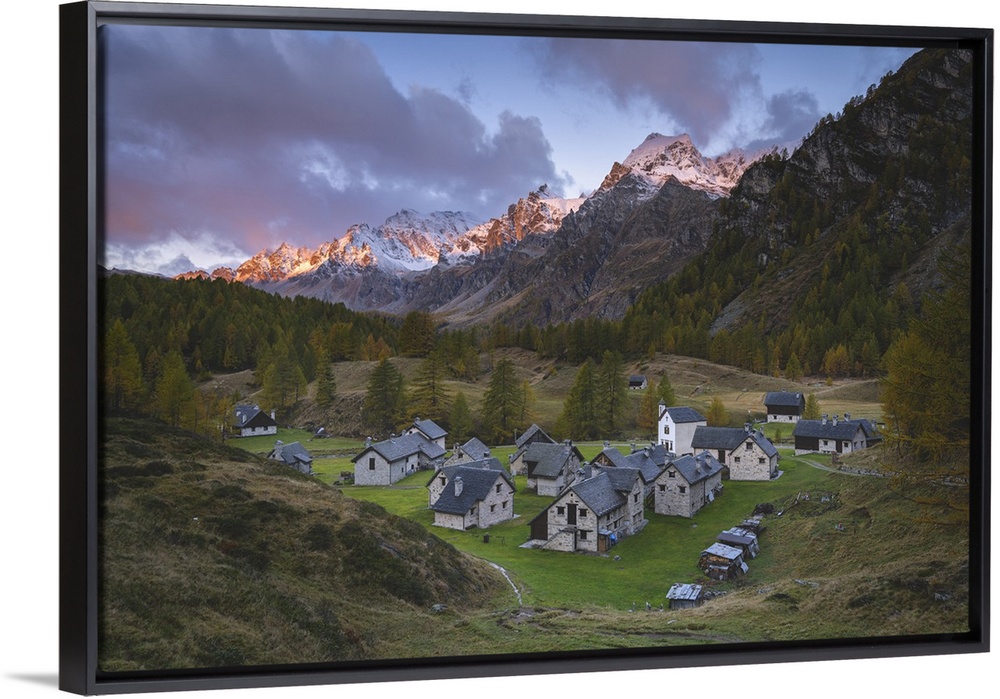 <p>Autumnal view of the Crampiolo town with the mountains surrounding Alpe Devero. Alpe Devero, Devero valley, Antigorio valley, Ossola valley, Piedmont, Verbano Cusio Ossola district, Italy.</p>