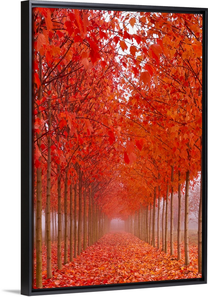 <p>A path covered in leaves between a row of thin trees in brilliant orange fall color.</p>
