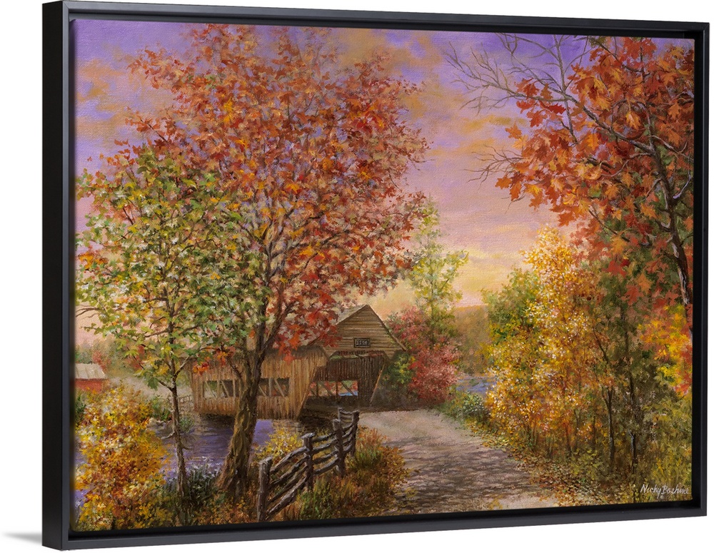 <p>Nicky Boehme imagines a world full of light and goodness in paintings that capture idyllic scenes of the laid-back life. Boehme is the consummate artist who painted as a young child and throughout her storied professional life. The dramatic interplay of light, color and mood create soothing scenery for wall art that will complement the atmosphere in quiet spaces such as bedrooms, reading nooks or dens. The world through the eyes and skilled brush strokes of Nicky Boehme glitters with romanticism and realism. You can almost taste the snow flurries covering a winter scene or hear the brook gurgling past a remote homestead.</p>