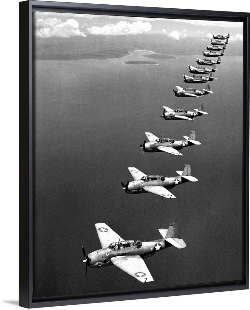 <p>A flight of twelve Grumman 'Avenger' torpedo-bombers over the South Pacific, 1943, during World War II.</p>