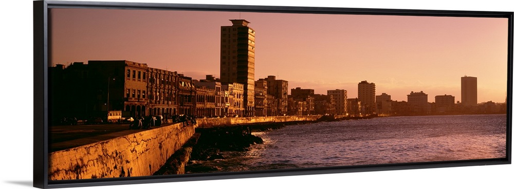 <p>This wide angle picture is taken of buildings lining a body of water in Havana Cuba during sun down.</p>