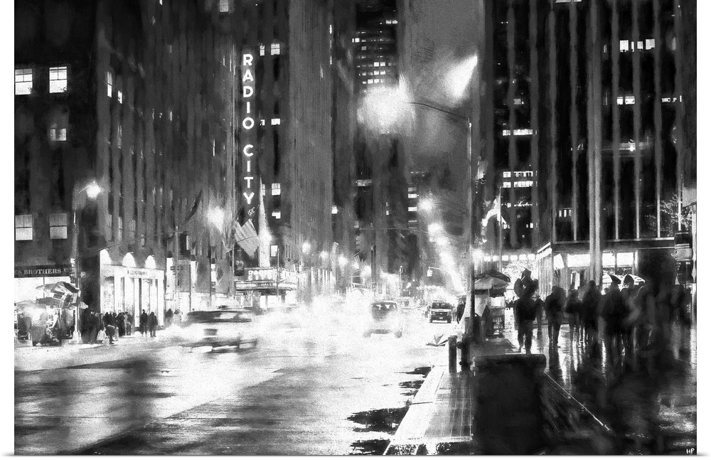 <p>Black and white photograph with a painterly effect of NYC at night.</p>
