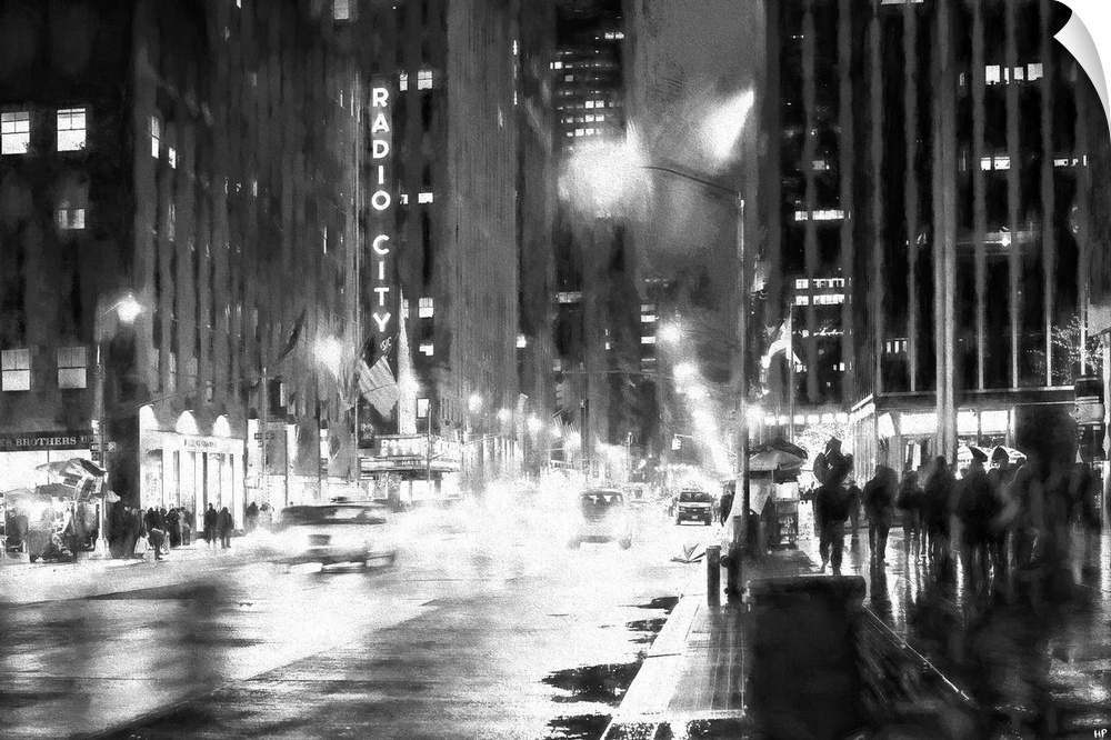 <p>Black and white photograph with a painterly effect of NYC at night.</p>