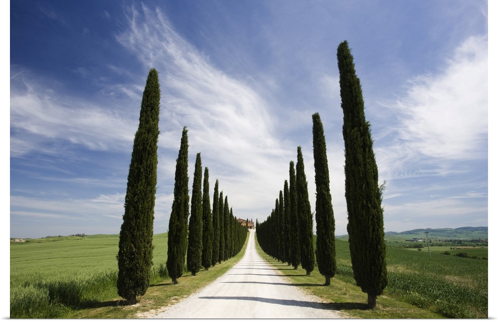 <p>Avenues of cypress trees and driveway leading to farmhouse, near Pienza, Tuscany, Italy, Europe</p>