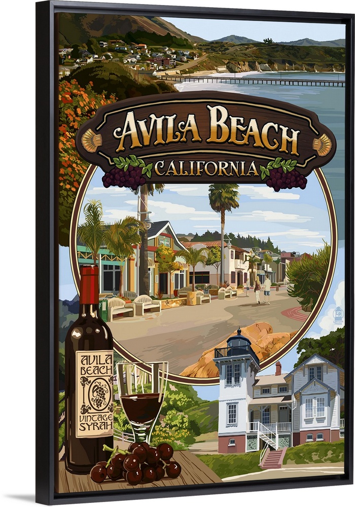 <p>Retro stylized art poster of a montage of images from a coastal town.</p>