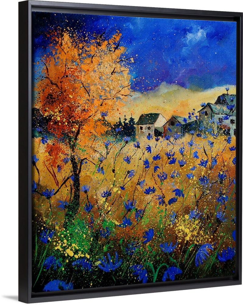 <p>A vertical abstract landscape of a field of blue flowers in front of a village.</p>