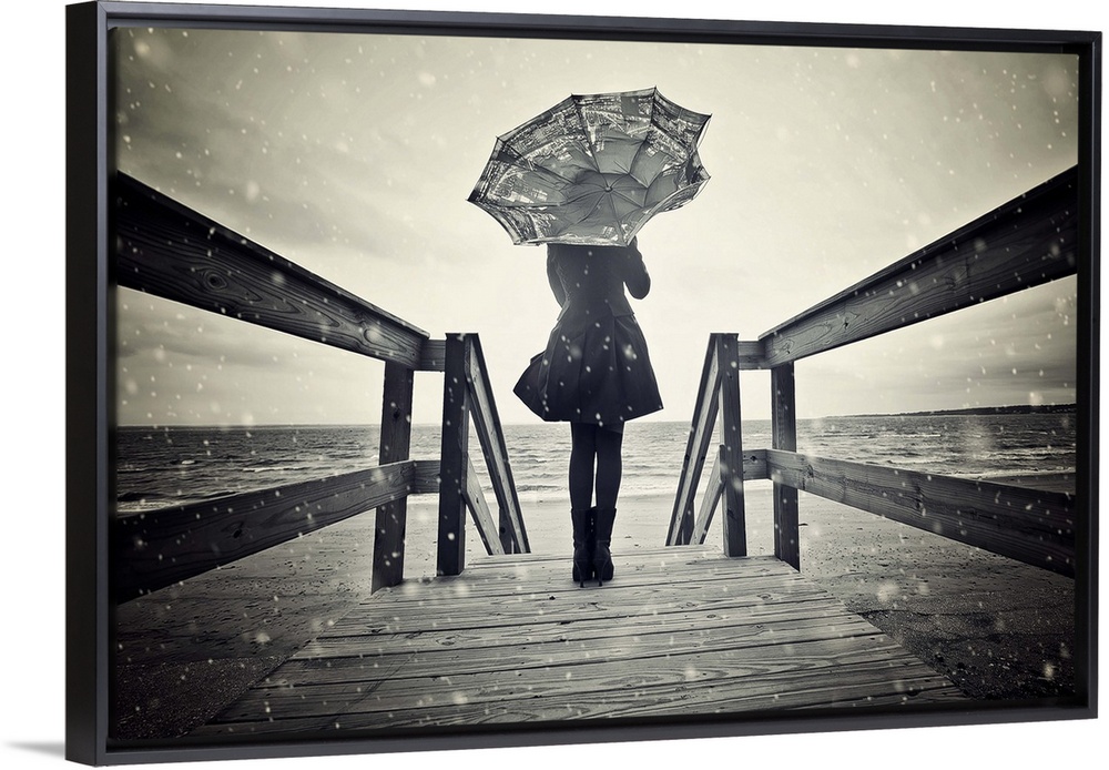<p>Black and white portrait of a woman standing on a wooden pier with a broken umbrella.</p>