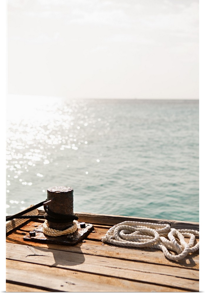 <p>Photograph of a floating dock waiting for a boat to tie up with the Caribbean in the background.</p>