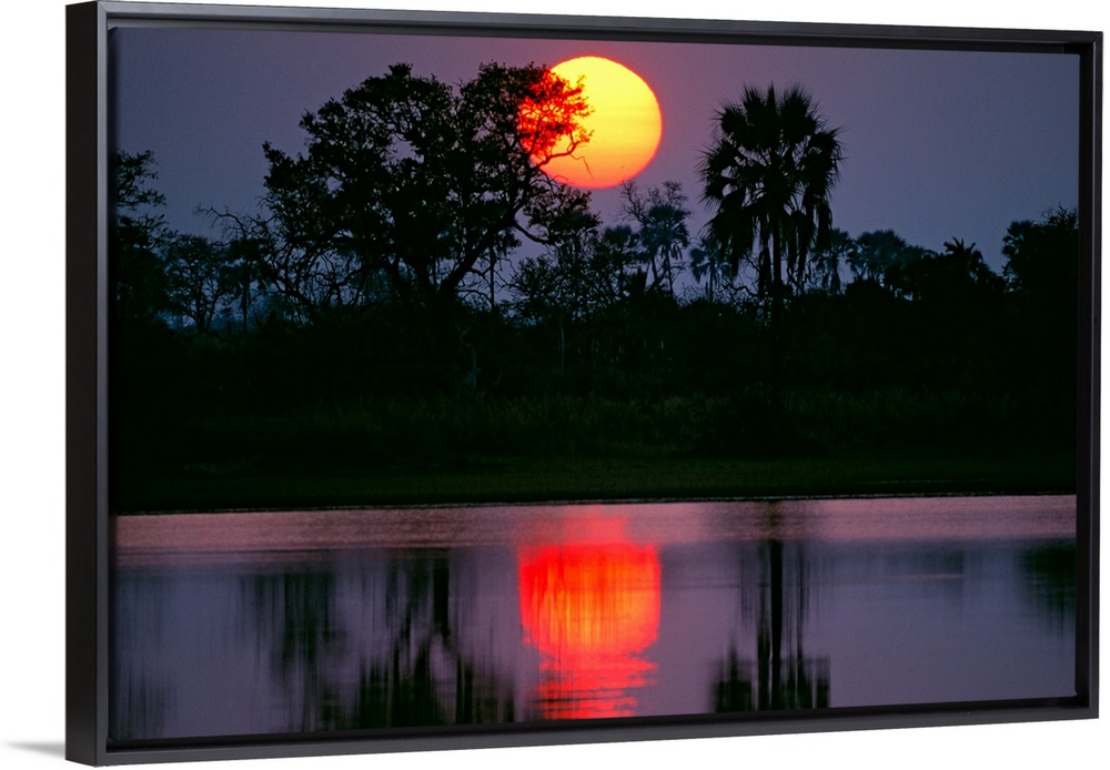 <p>Large photograph includes the sun setting behind a group of palm and acacia trees, which are in turn reflecting over a marsh within the Okavango Delta in Botswana.</p>