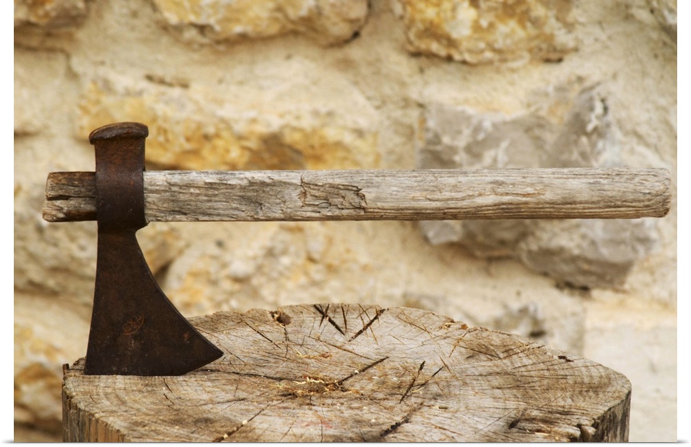 <p>An old rusty ax with a wooden handle struck down in a chopped up piece of wood chopping board. Moulin Mas des Barres olive mill, Maussanes les Alpilles, Bouches du Rhone, Provence, France, Europe</p>