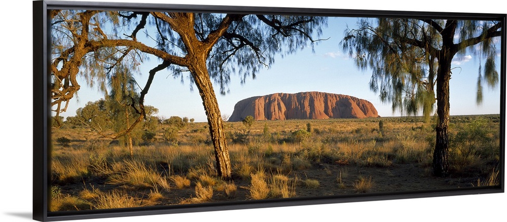 <p>This panoramic photograph is taken of Ayers Rock from a distance through trees and across massive terrain.</p>