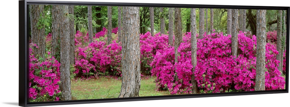 <p>Panoramic photograph flowering bushes in forest.</p>