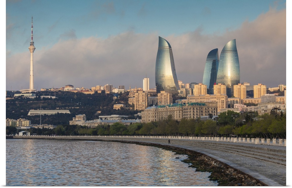 <p>Azerbaijan, Baku, City Skyline With Baku Television Tower And Flame Towers From Baku Bay</p>
