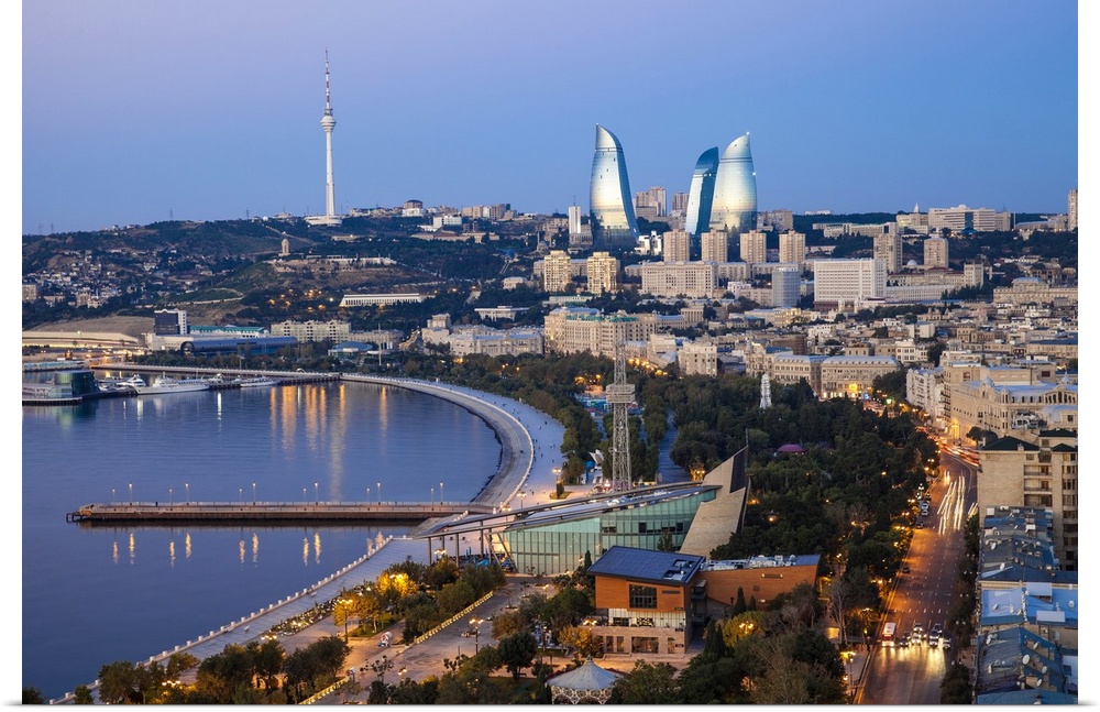 <p>Azerbaijan, Baku, View of city looking towards The Baku Business Center on the Bulvur - waterfront in the distance are Flame Towers and TV tower</p>