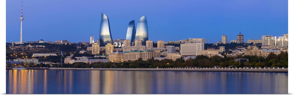 <p>Azerbaijan, Baku, View of the Flame Towers reflecting in the Caspian Sea</p>