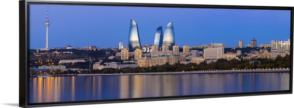 <p>Azerbaijan, Baku, View of the Flame Towers reflecting in the Caspian Sea</p>