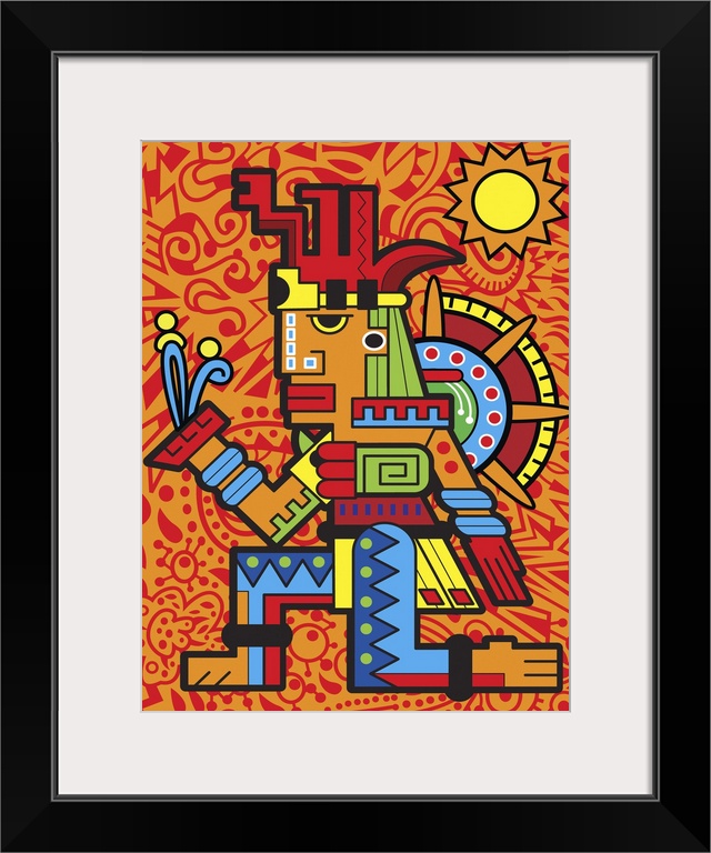 <p>Colorful urban art inspired Aztec design of a figure in elaborate patterns and colors. Against an intricately decorated background.</p>