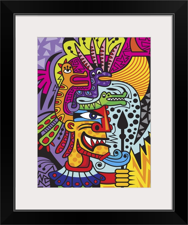 <p>Colorful urban art inspired Aztec warrior figure surrounded by vivid colors and patterns.</p>