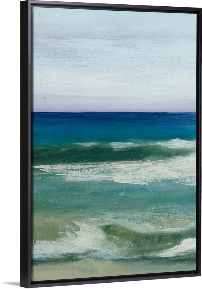 <p>Contemporary artwork of textured brush strokes that carve out a serene ocean scene.</p>