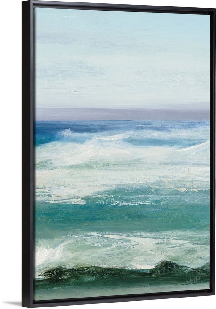 <p>Contemporary artwork of textured brush strokes that carve out a serene ocean scene.</p>