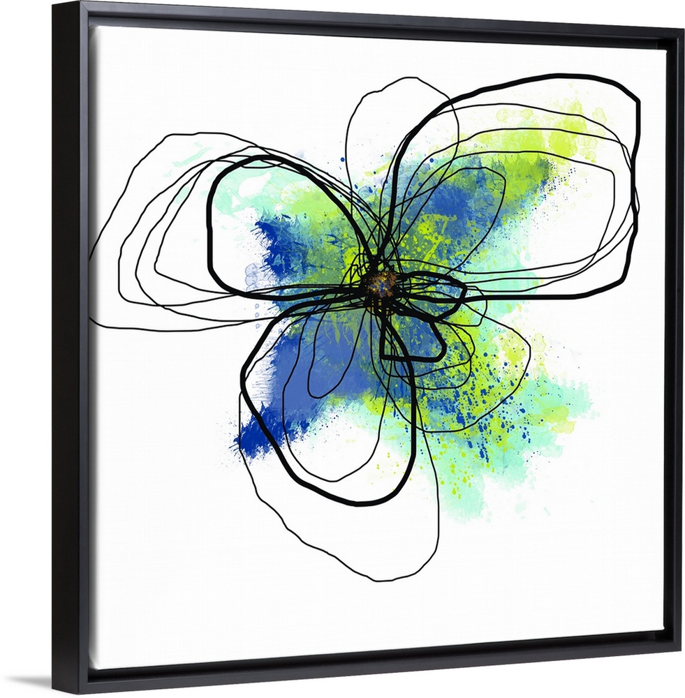 <p>Square abstract painting on canvas of the outline of a flower with various colored paint splashed in the middle of it.</p>