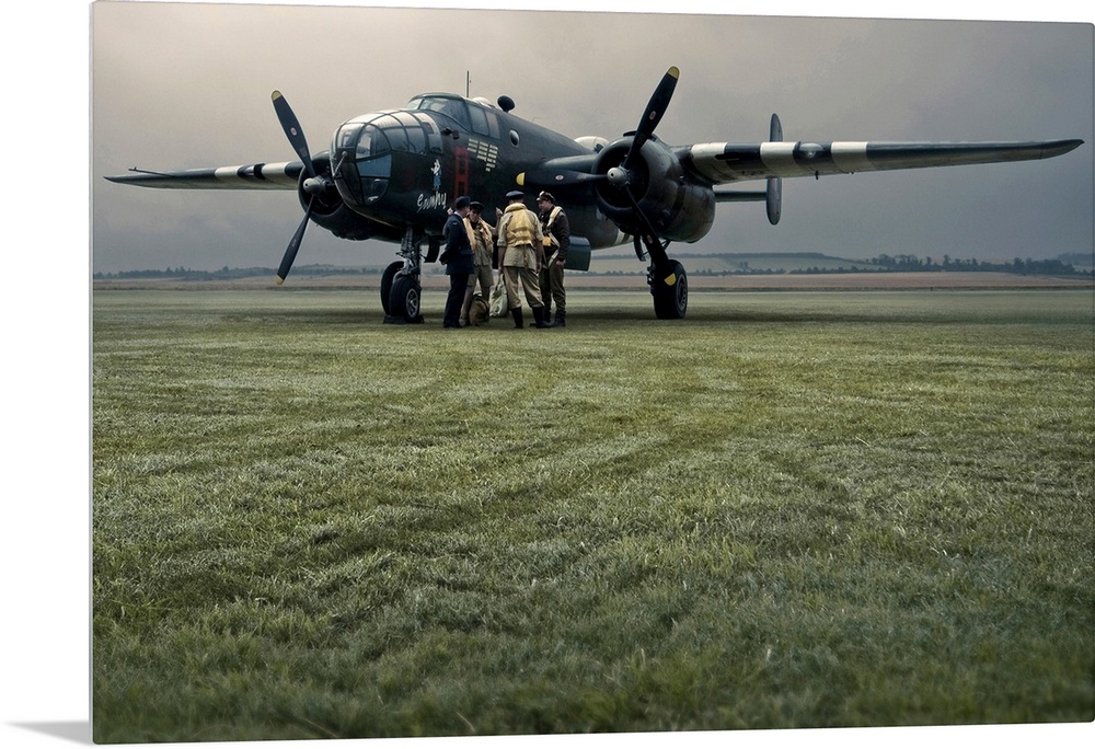 <p>A B-25 Mitchell bomber and crew at dawn</p>