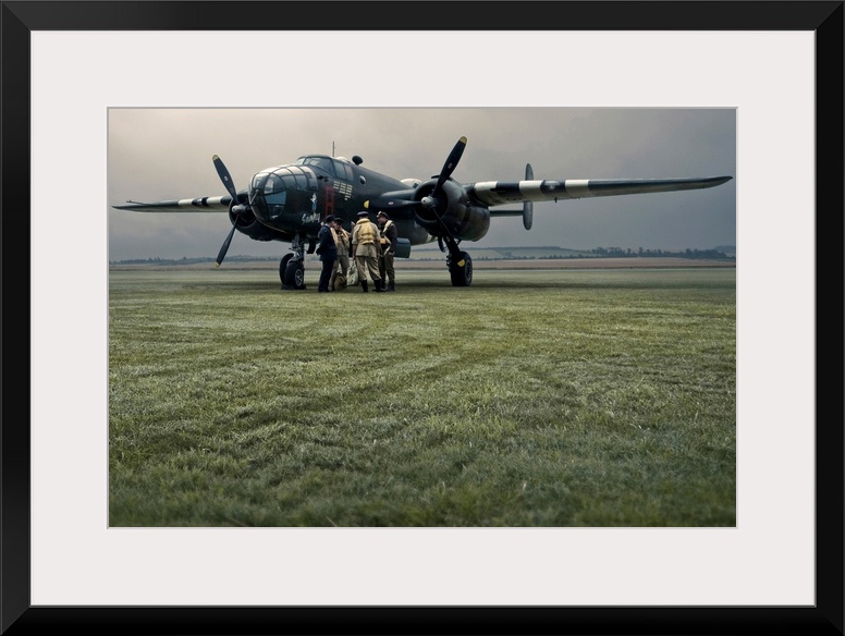 <p>A B-25 Mitchell bomber and crew at dawn</p>