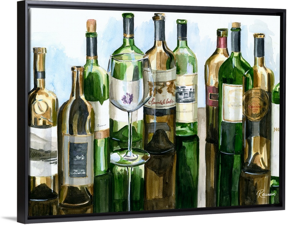 <p>Contemporary painting of a collection of green and brown wine bottles.</p>