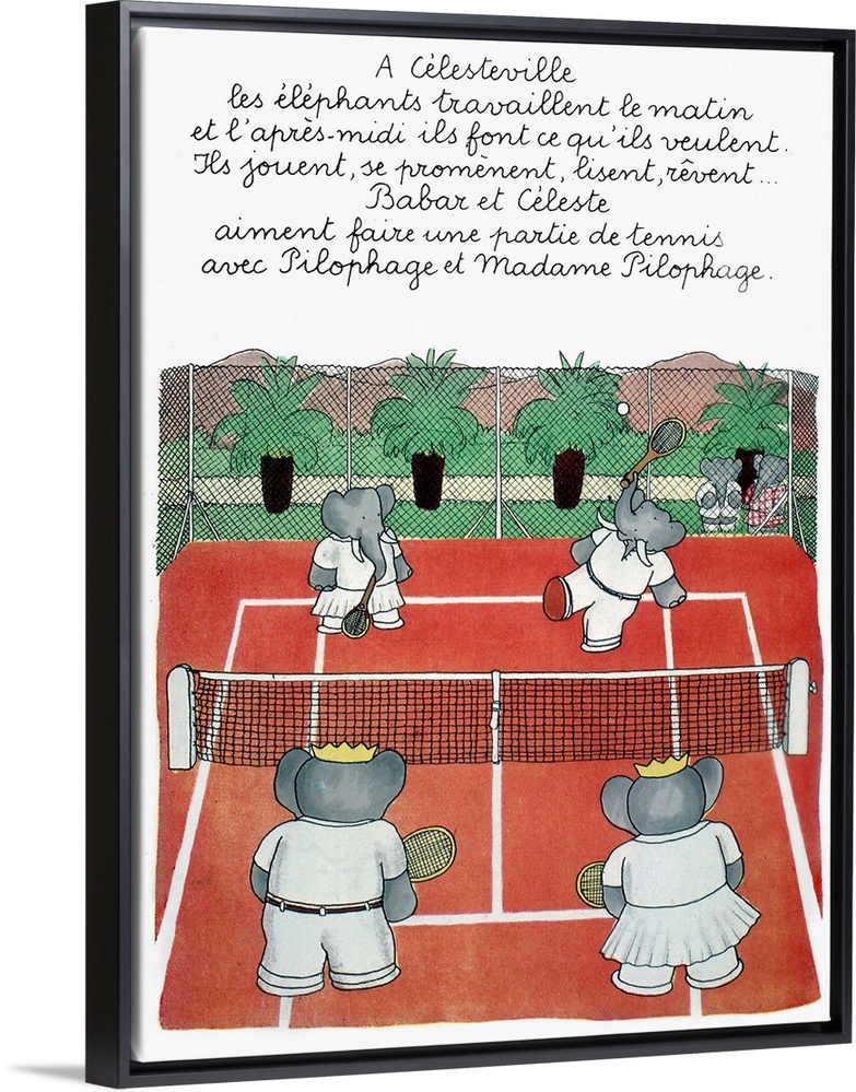 <p>Babar, king of the elephants, and Celeste playing tennis at Celesteville. Illustration from one of Jean de Brunhoff's Babar books,1930s.</p>