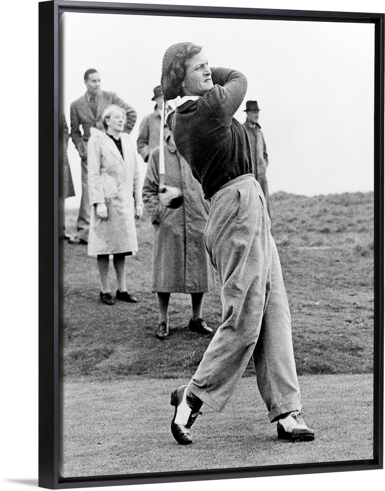 <p>Babe Didrikson, watching golf ball as she completes her swing. The multisport athlete was playing at the Ladies Amateur Championship, Gullane, Scotland, 1947.</p>