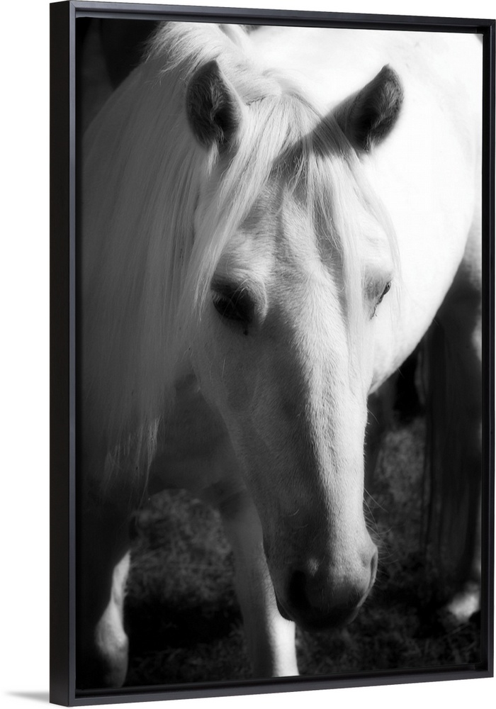 <p>A small horse is photographed closely so it's head is in the forefront of the picture with its body shown behind.</p>