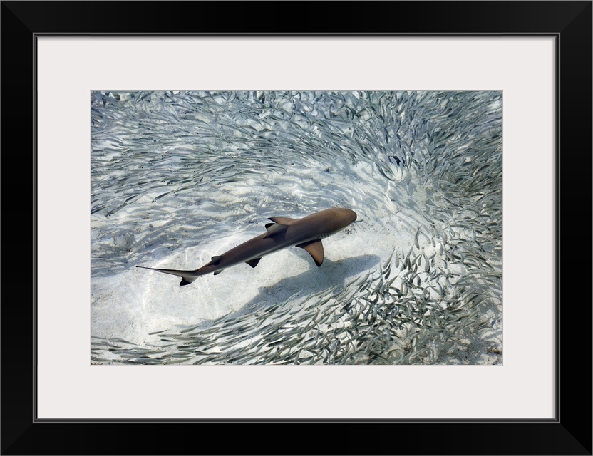 <p>Baby black-tip reef shark being surrounded by a school of silver sprats in a shallow lagoon, Maldives, Indian Ocean, Asia</p>