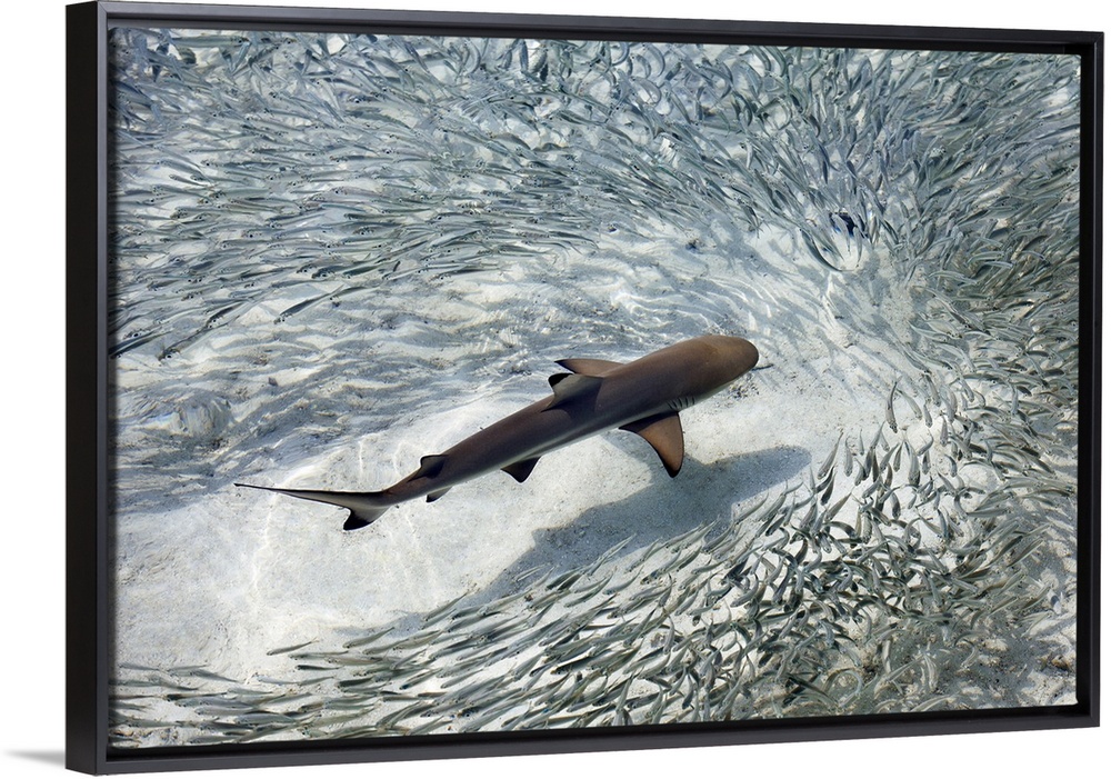 <p>Baby black-tip reef shark being surrounded by a school of silver sprats in a shallow lagoon, Maldives, Indian Ocean, Asia</p>